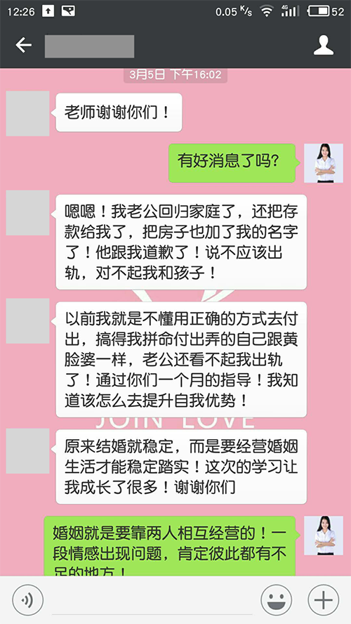 董小姐找到我们的时候,自己也是非常茫然的,自己怀着孩子,既不想家散了,让孩子在破碎家庭环境下长大,又难以原谅老公婆婆这种行为。通过我们的疏导,先是让她的情绪稳定住,并且通过分析利弊让她明白自己需要做的事情,在我们团队通力合作,以及半年的耐心陪伴下,终于让丈夫归心,且让自己舒心了。