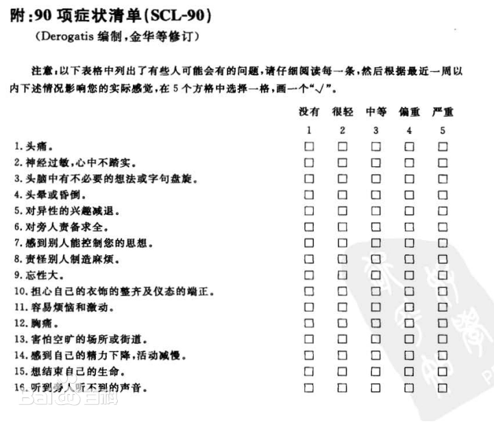 症状自评量表,又称90项症状清单(symptom checklist 90, SCL-90),由Derogatis等编制于1973年,包括9个因子,共90个项目,用于心理健康与行为问题的测量。